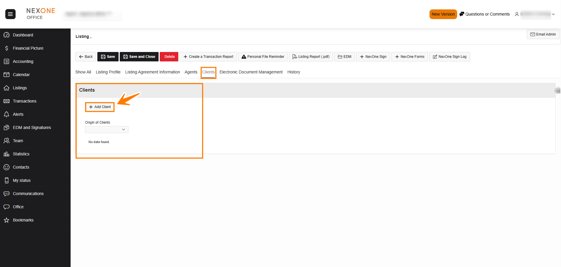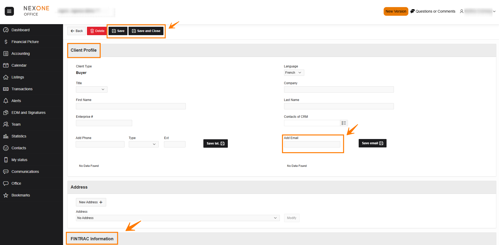 Enter client's information, including their email for signature request. Complete FINTRAC if available, then save and close.