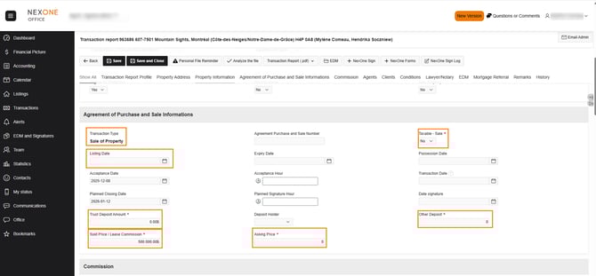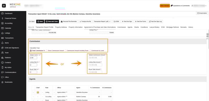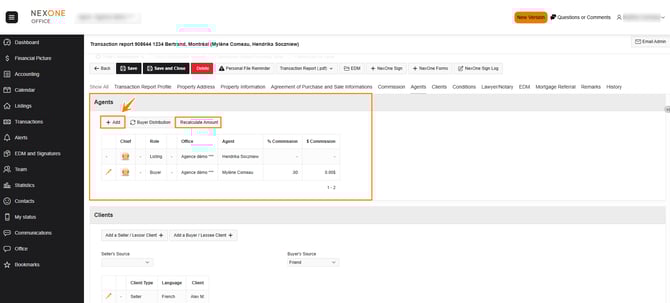 If the commission is not automatically adjusted in the agents section after your modifications, click on the recalculate button for the Listing or Selling side. Don't forget to save by clicking on the Save button.