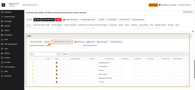 In the EDM section (Electronic Document Management), you can view the list of required documents (configured by your office) by pressing Refresh Mandatory Documents .