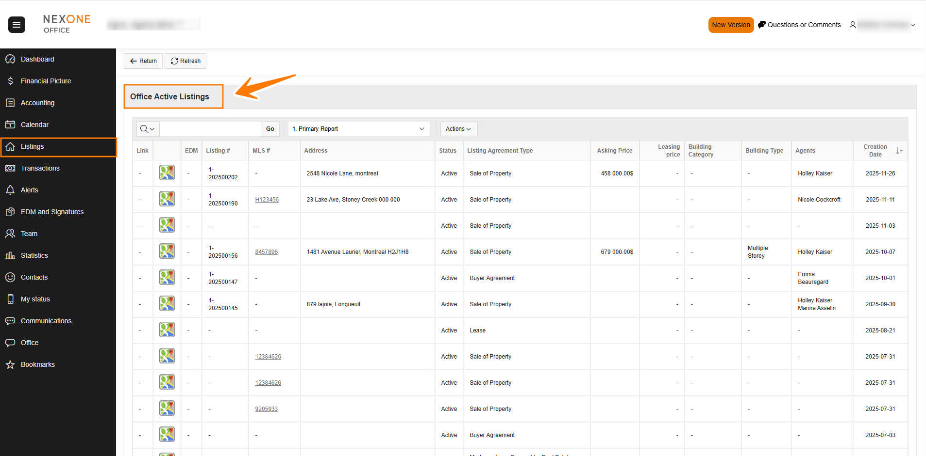 - Office Active: The office active section shows all current listings for your office. You will not be able to edit these listings unless they are yours or view anything that you would not see on MLS / Centris.