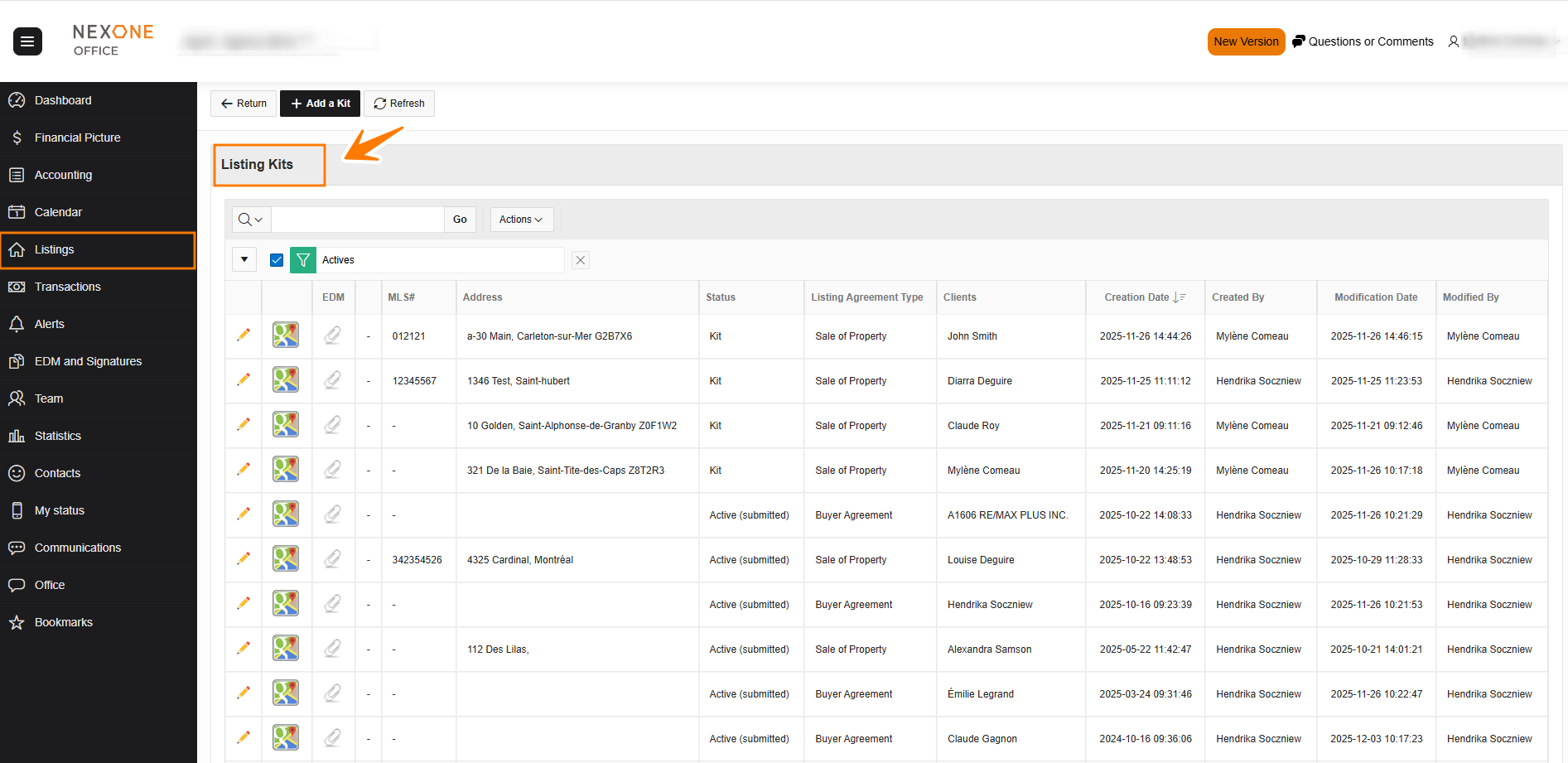 - Kits: This section shows the agent his listings with a KIT status.