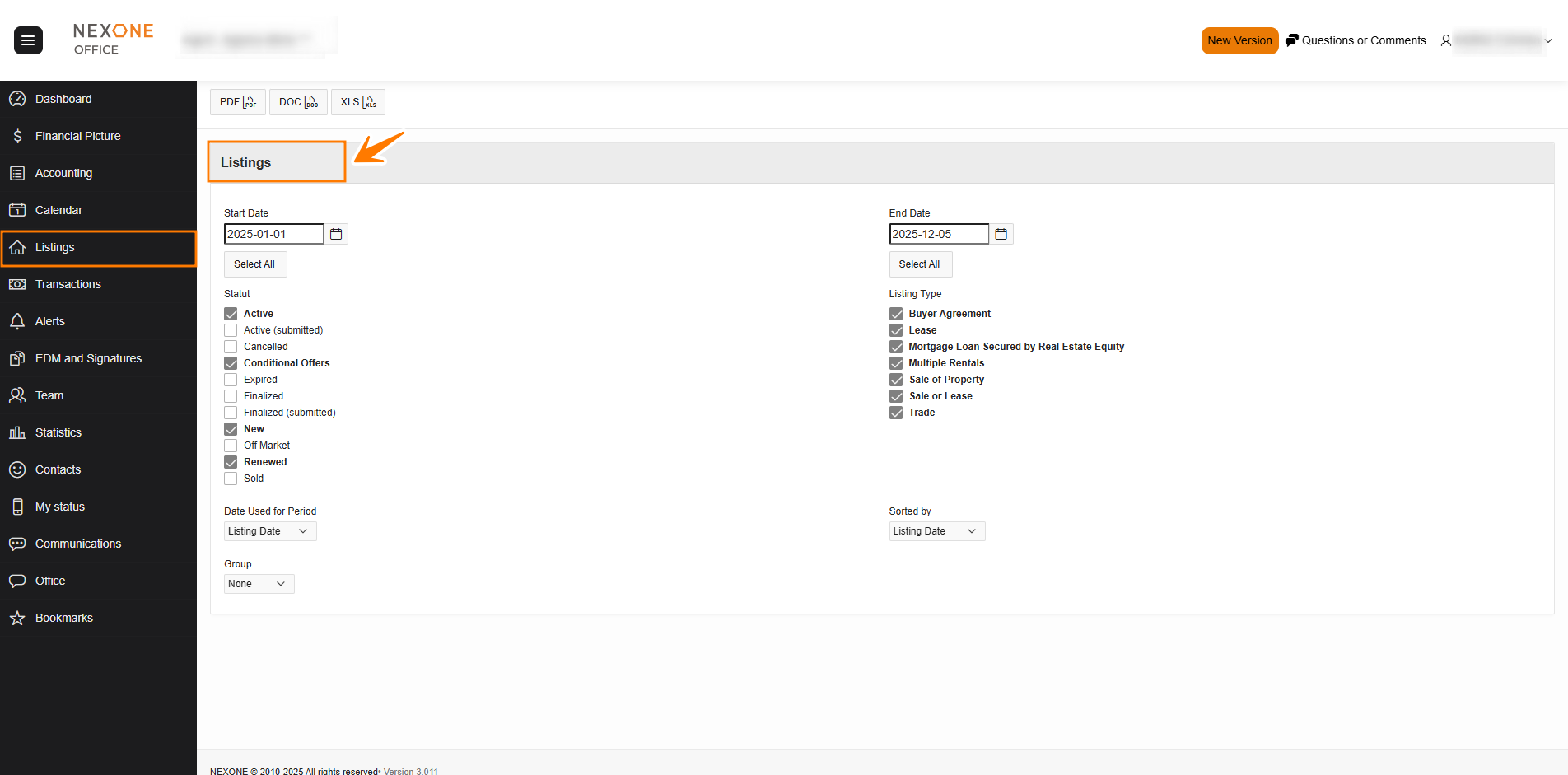 Detailed List: Allows agents to create a listing report using selected filters.