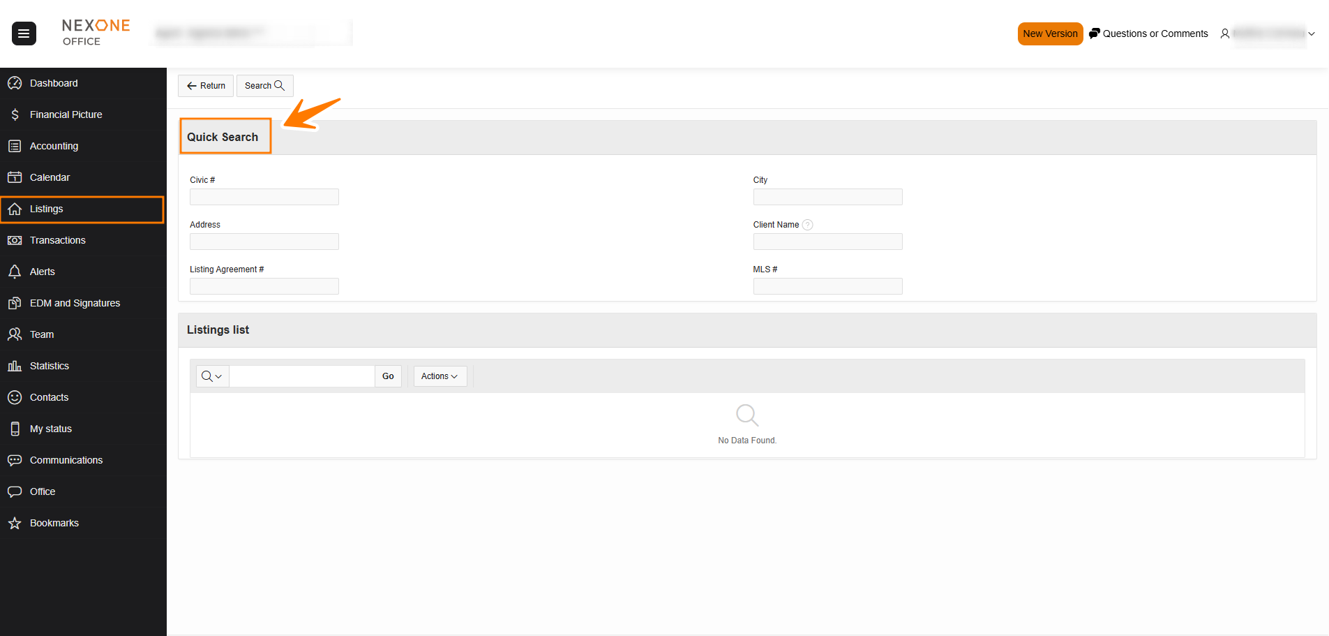 - Quick Search: This section allows agents to quickly search through all their listings.