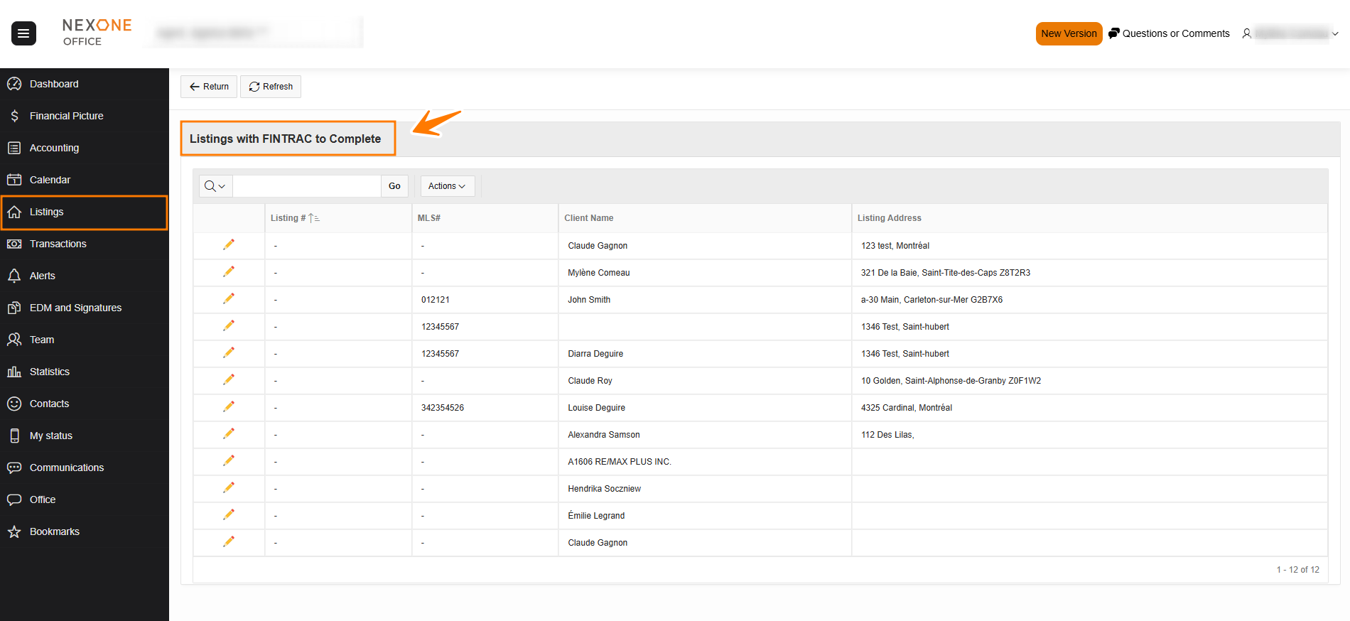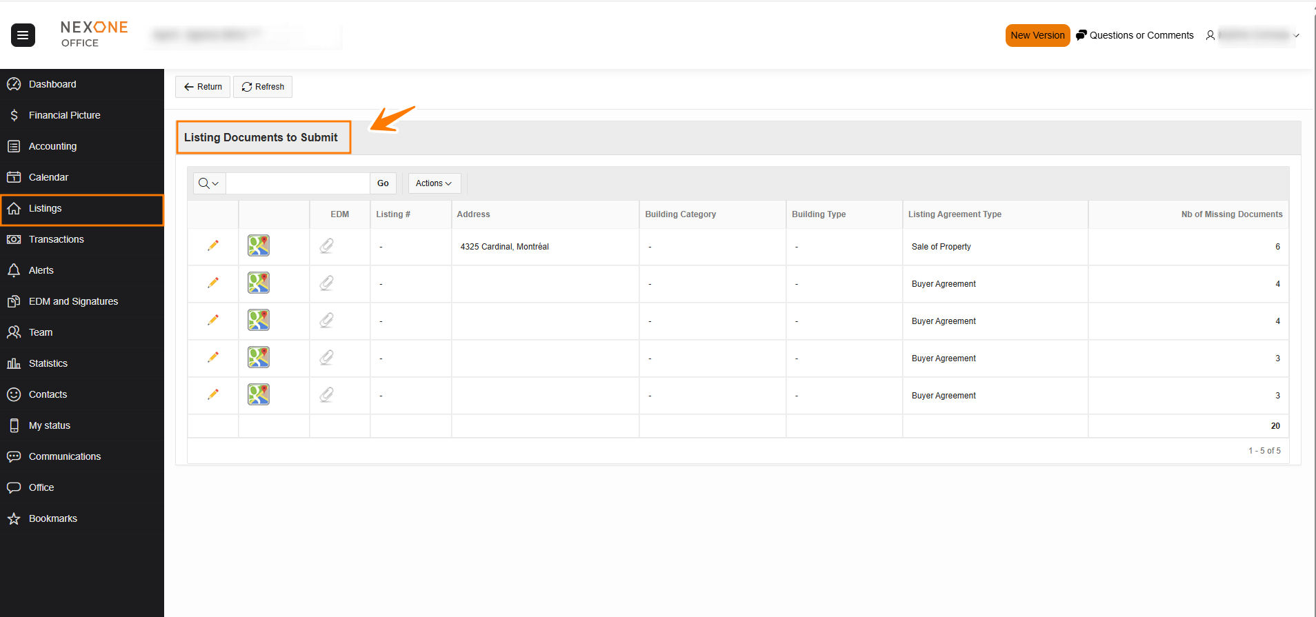 - Documents to submit: Allows the agent to see a list of all listings for which mandatory documents are missing.