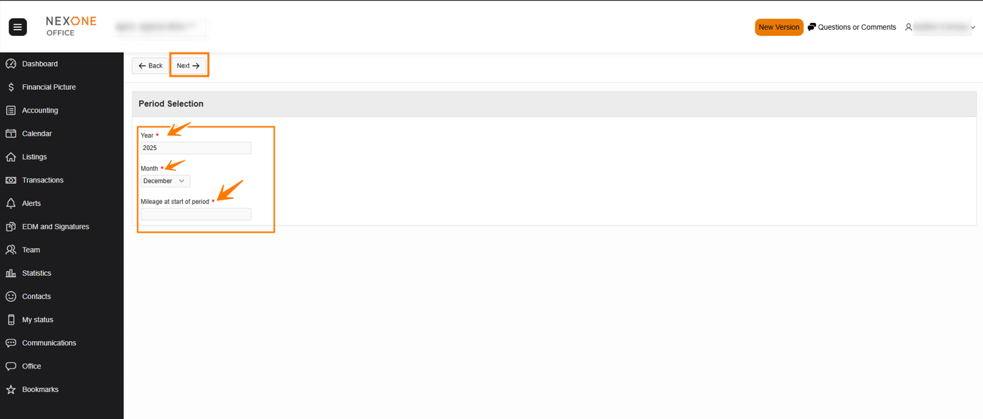 Enter the period (year and month) and the mileage at the beginning of the period and then next.