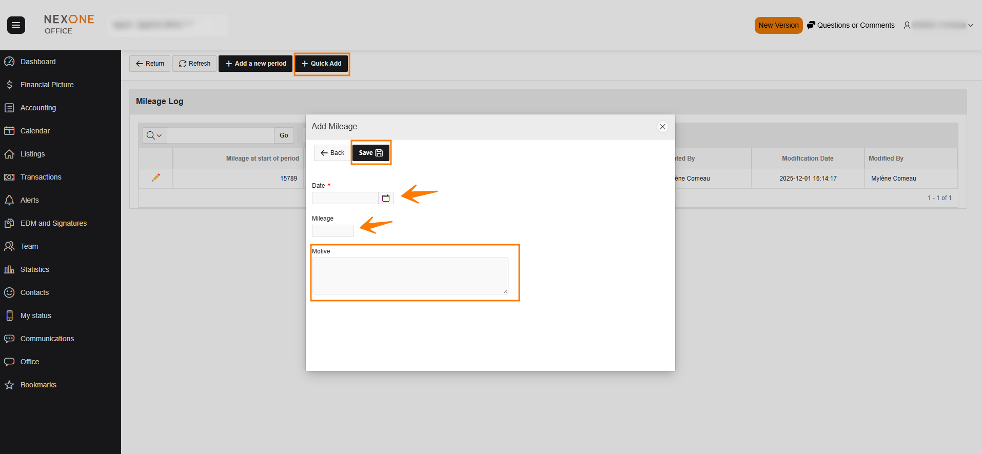 This option allows a quick addition of punctual mileage, you just have to fill in the date, the number of km, a reason and save.